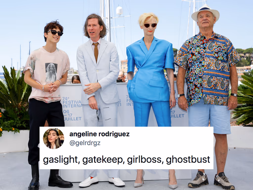 The French Dispatch Cast at Cannes meme started with a photo of actors Timothée Chalamet, Tilda Swinton and Bill Murray and director Wes Anderson at the Cannes Film Festival, promoting their film The French Dispatch. The photo shows the celebs in four very different outfits, leading Twitter users to joke about them representing four connected but very different things.