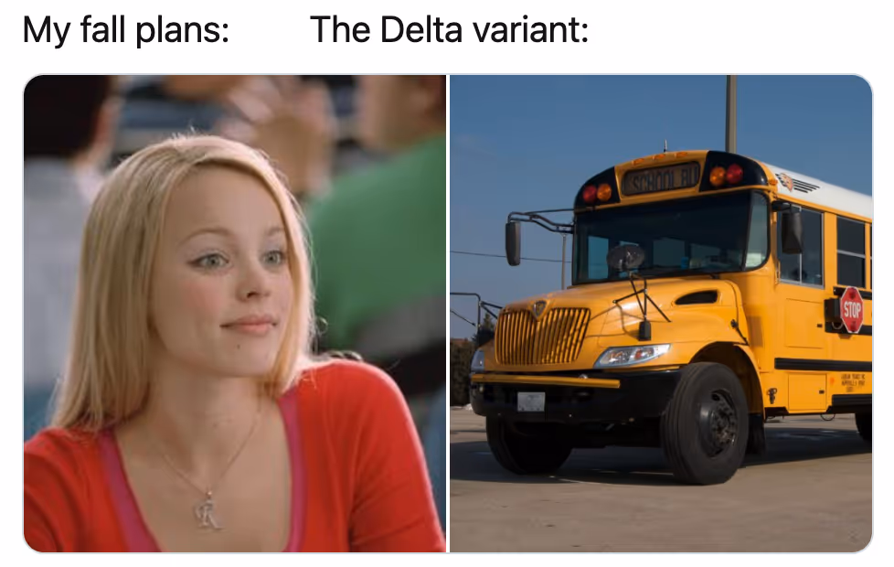 Over the next few days, the format saw increased usage as people used famous characters from film and television to represent “fall plans” and the thing that kills or harms them as “the delta variant”. Here’s a personal favourite, featuring Regina George from Mean Girls: